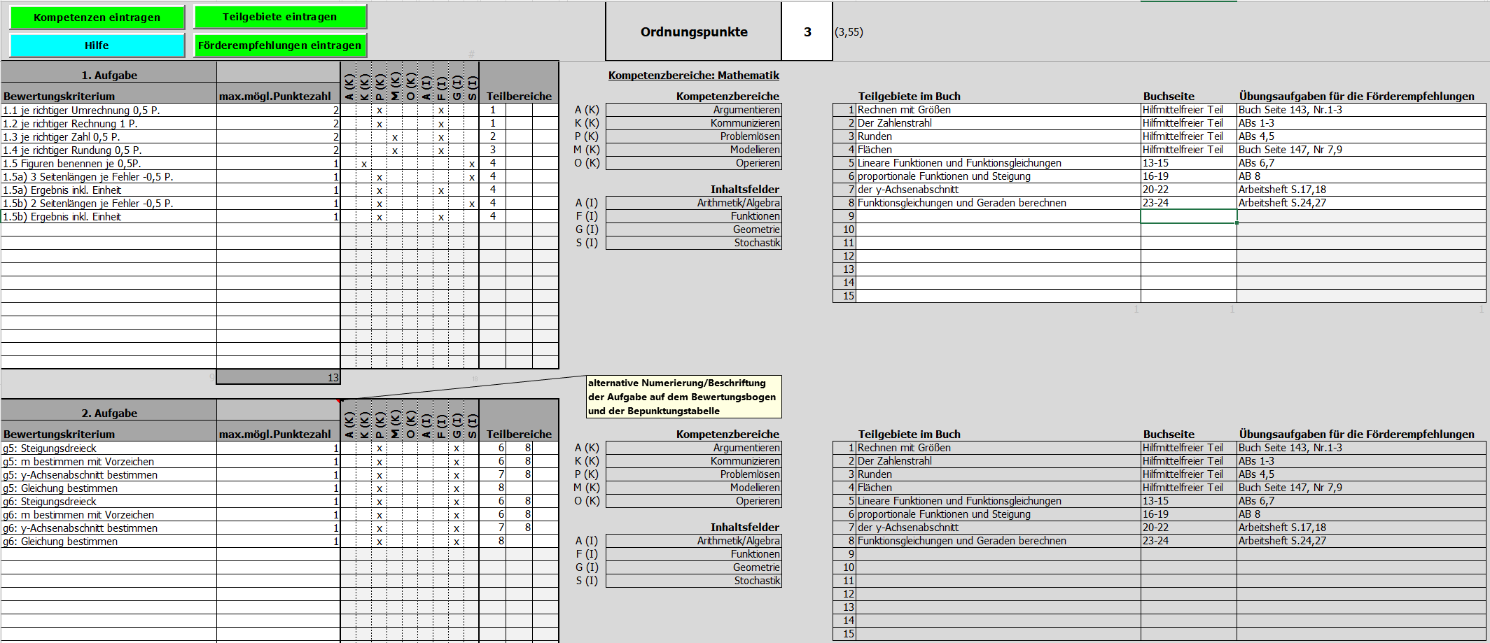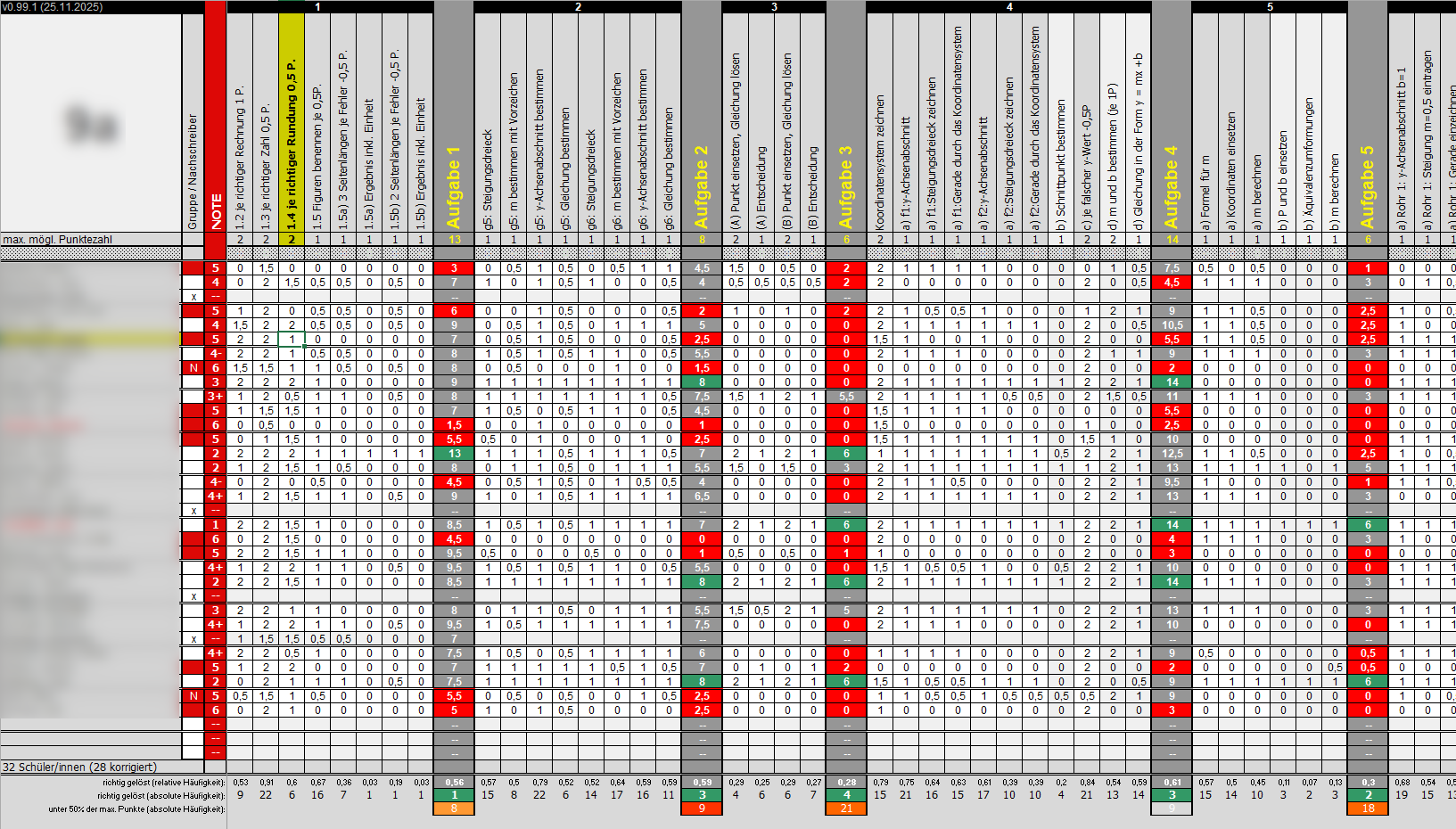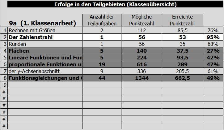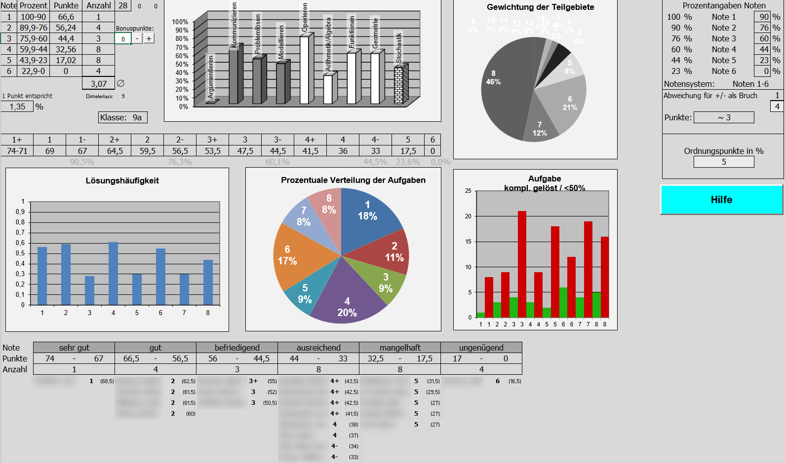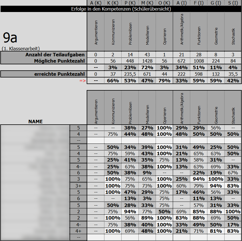- Auswertung der erreichten Punkte in bestimmten Teilgebieten pro Schüler und für die gesamte Klasse
