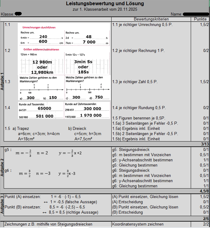 - Ausdruck des Bewertungsrasters mit erreichten Punkten für jeden Schüler mit eingearbeiteter Musterlösung