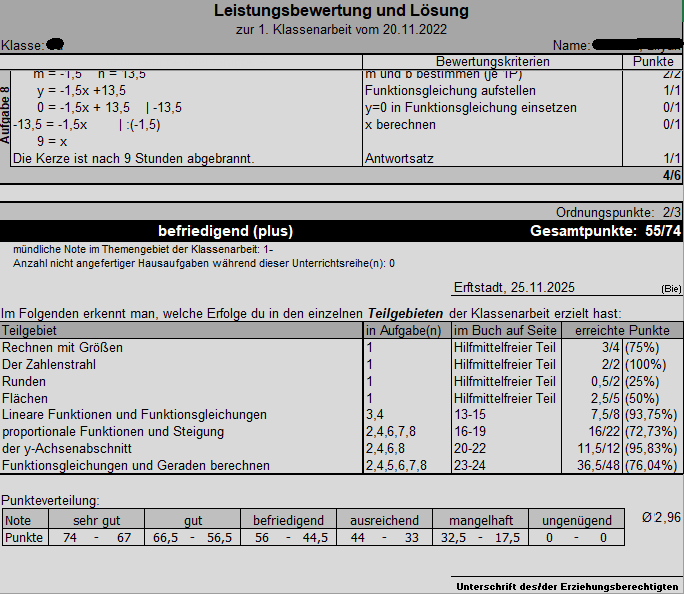 Wenn gewünscht und eingegeben können als Rückmeldung für die Schüler weitere Kriterien ausgegeben werden. (mündl. Note, nicht angefertigte Hausaufgaben und Erfolge in den Teilgebieten, sowie eine weitere frei wählbare Notenkategorie)