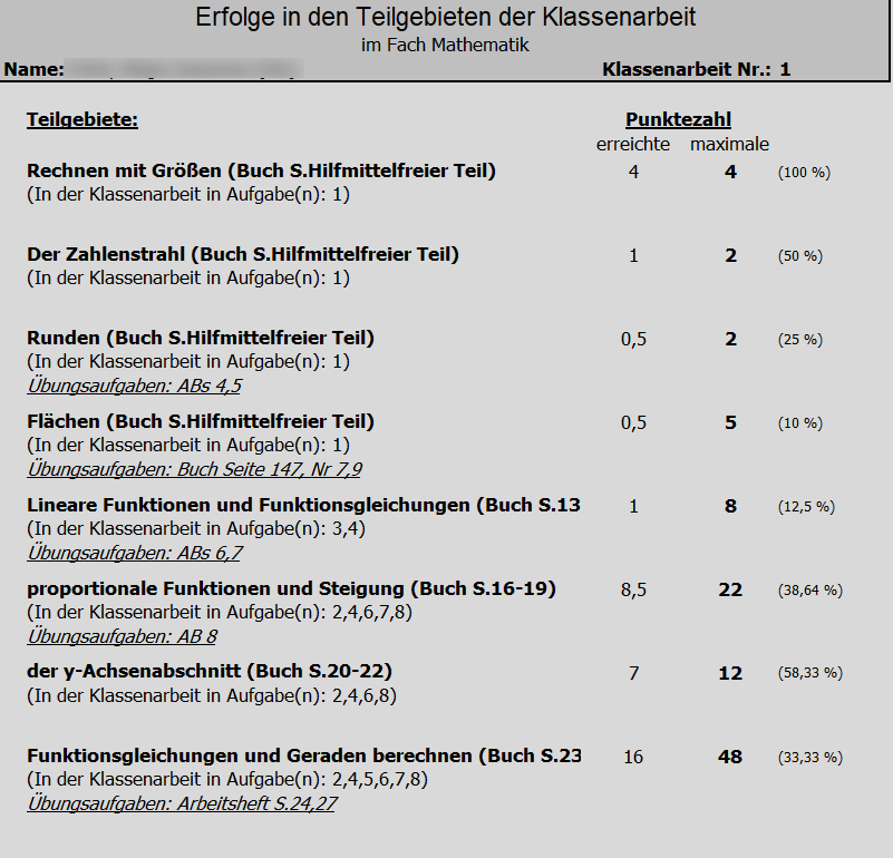 - Ausdruck eines individuellen Förderplans für jeden Schüler nach Zuordnung der Aufgaben zu entsprechenden Teilgebieten